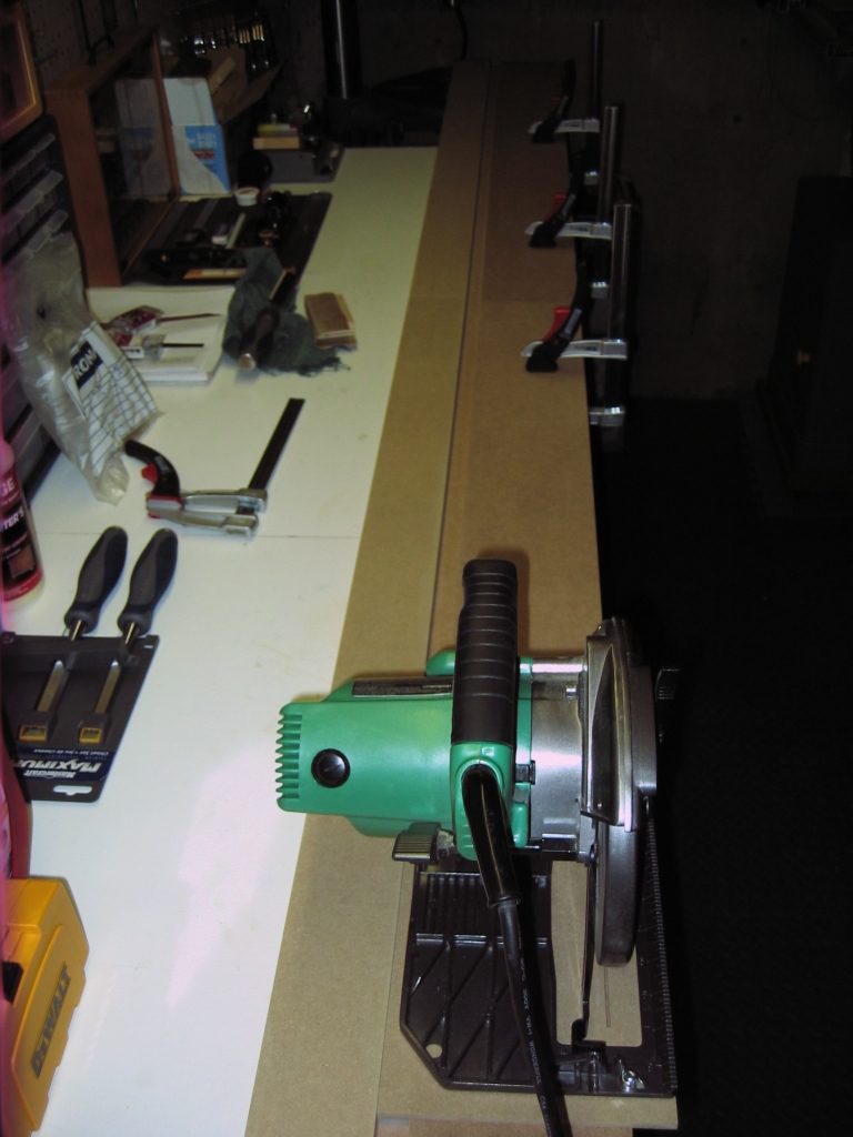 The final step is to size and align the rails with the saw blade. Assemble everything and sit on a surface that allows you to do this safely. Make a pass with your circular saw along the entire length of the two rails.
